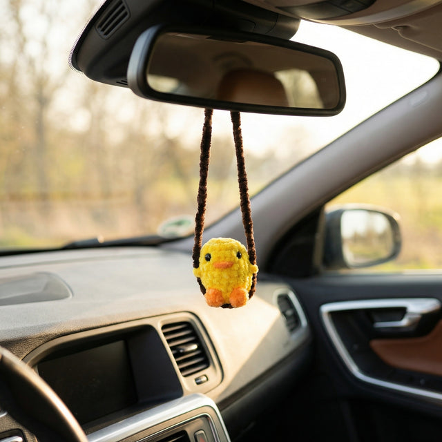 Kitet innehåller allt du behöver för att skapa din egen gungande anka: garn, mönster, virknål, fyllningsvadd, säkerhetsögon, maskmarkör och stoppnål. När du är klar får du en färdig liten figur som kan hänga i backspegeln och gunga fram och tillbaka när du kör.